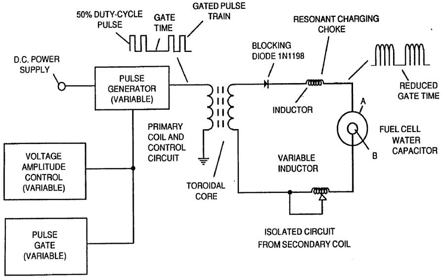 What is claimed is: 1. A method of obtaining the release of a gas mixture including hydrogen and oxygen and other dissolved gases formerly entrapped in water, from water, consisting of: (A) providing a capacitor in which water is included as a dielectric between capacitor plates, in a resonant charging choke circuit that includes an inductance in series with the capacitor; (B) subjecting the capacitor to a pulsating, unipolar electric charging voltage in which the polarity does not pass beyond an arbitrary ground, whereby the water molecules within the capacitor are subjected to the electric field between the capacitor plates; (C) further subjecting the water in said capacitor to a pulsating electric field resulting from the subjection of the capacitor to the charging voltage such that the pulsating electric field induces a resonance within the water molecules; (D) continuing the application of the pulsating charging voltage to the capacitor after resonance occurs so that the energy level within the molecules is increased in cascading incremental steps in proportion to the number of pulses; (E) maintaining the charge of said capacitor during the application of the pulsating charging voltage, whereby the covalent electrical bonding of the hydrogen and oxygen atoms within said molecules is destabilized, such that the force of the electrical field applied to the molecules exceeds the bonding force within the molecules, and hydrogen and oxygen atoms are liberated from the molecules as elemental gases. 2. The method of claim 1 including the further steps of collecting said liberated hydrogen and oxygen gases, and any other gases that were formerly dissolved with in the water and discharging said collected gases as a fuel gas mixture. Field of Invention This invention relates to a method of and apparatus for obtaining the release of a fuel gas mixture including hydrogen and oxygen from water. BACKGROUND OF THE PRIOR ART Numerous processes have been proposed for separating a water molecule into its elemental hydrogen and oxygen components. Electrolysis is one such process. Other processes are described in United States patents such as 4,344,831; 4,184,931; 4,023,545; 3,980,053; and Patent Cooperation Treaty application No. PCT/US80/1362, published 30 April, 1981. OBJECTS OF THE INVENTION It is an object of the invention to provide a fuel cell and a process in which molecules of water are broken down into hydrogen and oxygen gases, and a fuel gas mixture including hydrogen, oxygen and other gasses formerly dissolved within the water is produced. As used herein the term "fuel cell" refers to a single unit of the invention comprising a water capacitor cell, as hereinafter explained, that produces the fuel gas in accordance with the method of the invention. Brief Description of the Drawings FIG. 1 illustrates a circuit useful in the process. FIG. 2 shows a perspective of a "water capacitor" element used in the fuel cell circuit. FIGS. 3A through 3F are illustrations depicting the theoretical bases for phenomena encountered during operation of the invention herein. Description of the Preferred Embodiment In brief, the invention is a method of obtaining the release of a gas mixture including hydrogen and oxygen and other dissolved gases formerly entrapped in water, from water consisting of: (A) providing a capacitor, in which the water is included as a dielectric liquid between capacitor plates, in a resonant charging choke circuit that includes an inductance in series with the capacitor; (B) subjecting the capacitor to a pulsating, unipolar electric voltage field in which the polarity does not pass beyond an arbitrary ground, whereby the water molecules within the capacitor are subjected to a charge of the same polarity and the water molecules are distended by their subjection to electrical polar forces; (C) further subjecting the water in said capacitor to said pulsating electric field to achieve a pulse frequency such that the Pulsating electric field induces a resonance within the water molecule; (D) continuing the application of the pulsing frequency to the capacitor cell after resonance occurs so that the energy level within the molecule is increased in cascading incremental steps in proportion to the number of pulses; (E) maintaining the charge of said capacitor during the application of the pulsing field, whereby the co-valent electrical bonding of the hydrogen and oxygen atoms within said molecules is destabilized such that the force of the electrical field applied, as the force is effective within the molecule, exceeds the bonding force of the molecule, and hydrogen and oxygen atoms are liberated from the molecule as elemental gases; and (F) collecting said hydrogen and oxygen gases, and any other gases that were formerly dissolved within the water, and discharging the collected gases as a fuel gas mixture. The process follows the sequence of steps shown in the following Table I in which water molecules are subjected to increasing electrical forces. In an ambient state, randomly oriented water molecules are aligned with respect to a molecular polar orientation. They are next, themselves polarized and "elongated" by the application of an electric Potential to the extent that covalent bonding of the water molecule is so weakened that the atoms disassociate and the molecule breaks down into hydrogen and oxygen elemental components. Engineering design parameters based on known theoretical principles of electrical circuits determine the incremental levels of electrical and wave energy input required to produce resonance in the system whereby the fuel gas comprised of a mixture of hydrogen, oxygen, and the other gases such as air test were formerly dissolved within the water, is produced. TABLE I ______________________________________ PROCESS STEPS THE SEQUENCE OF THE RELATIVE STATE OF THE WATER MOLECULE AND/OR HYDROGEN/OXYGEN/OTHER ATOMS: ______________________________________ A. (AMBIENT STATE)